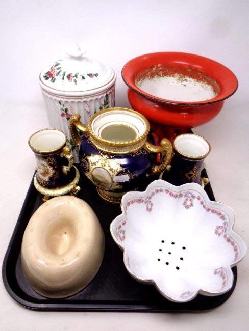 A tray containing china jelly mould Coalport blue and gilt porcelain vases (a/f), Shelley pedestal bowl etc
