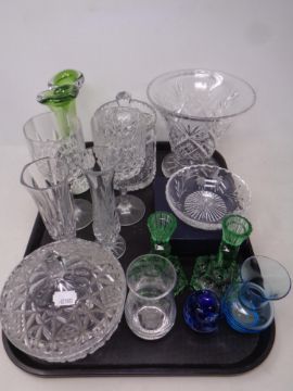 A tray of assorted glass ware to include Stuart crystal boxed dish, green glass candlesticks, lead crystal vase and biscuit barrel, paperweight etc