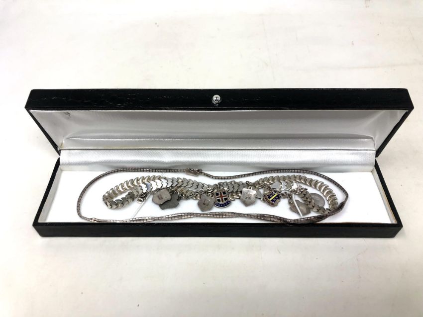 Two silver necklaces and a bracelet with enamel charms