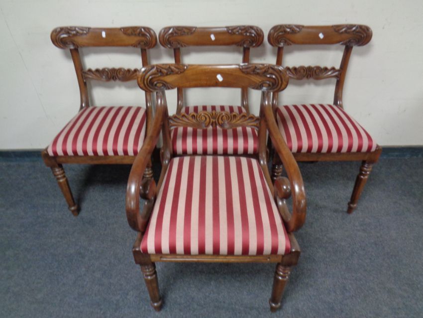 A set of four 19th century mahogany dining chairs comprising of scroll arm armchair and three singles