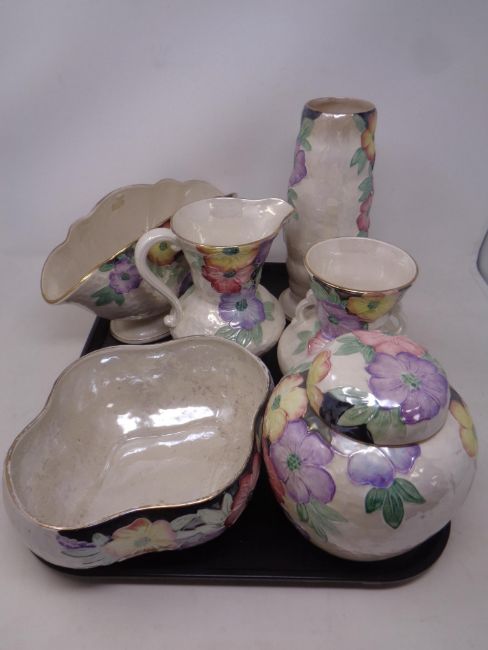 A tray containing six pieces of Maling Petunia patterned china together with a Maling Tyneside pottery book