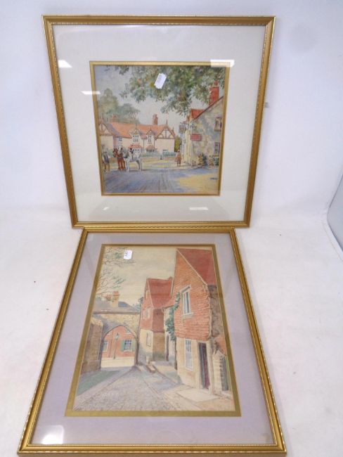 A watercolour study depicting a cobbled street in gilt frame and mount together with a further watercolour depicting work horses on a village street in gilt frame and mount