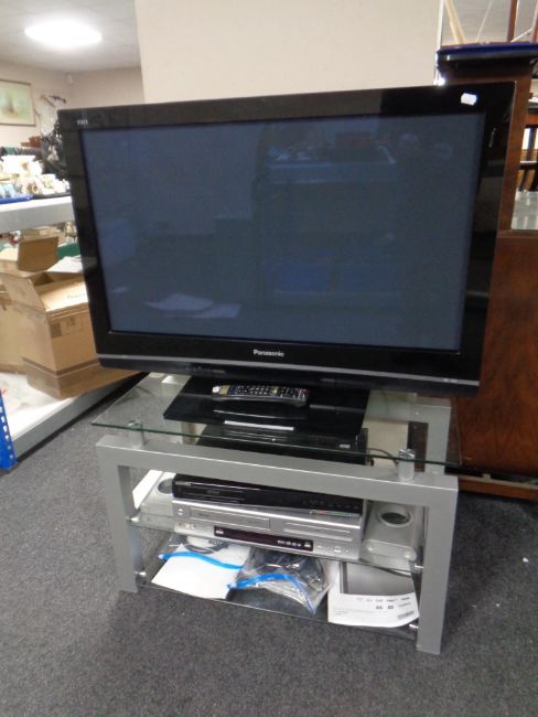 A Panasonic Viera 37" plasma TV on stand together with a Samsung DVD recorder and a Tevion DVD VCR recorder, all with leads, remotes and instructions
