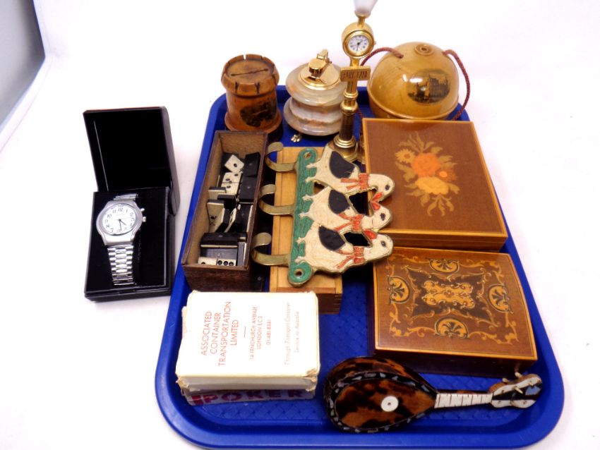 A tray of miniature tortoiseshell mandolin, onyx table lighter, Mauchline ware pomander depicting Inveraray Castle etc