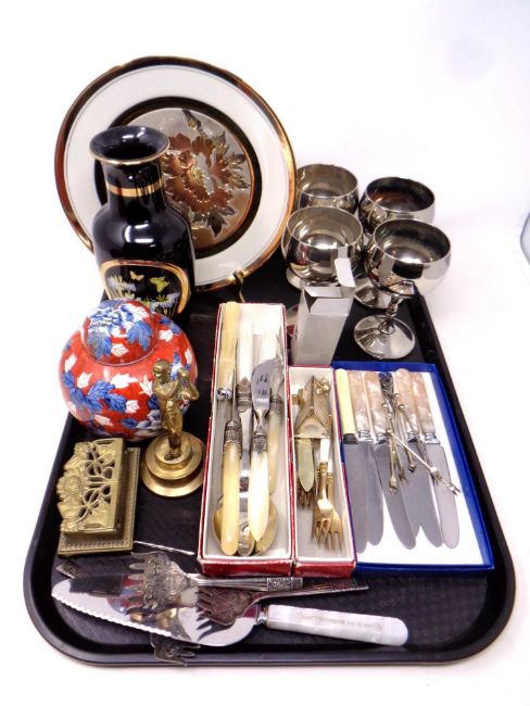 A tray of four stainless steel goblets, oriental ceramics, loose cutlery etc