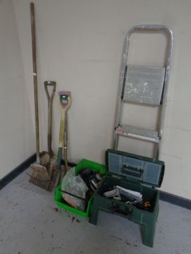 A garden storage stool and box containing power tools, hand tools, brass door handles together with a pair of folding aluminium garden steps and a bundle of garden tools