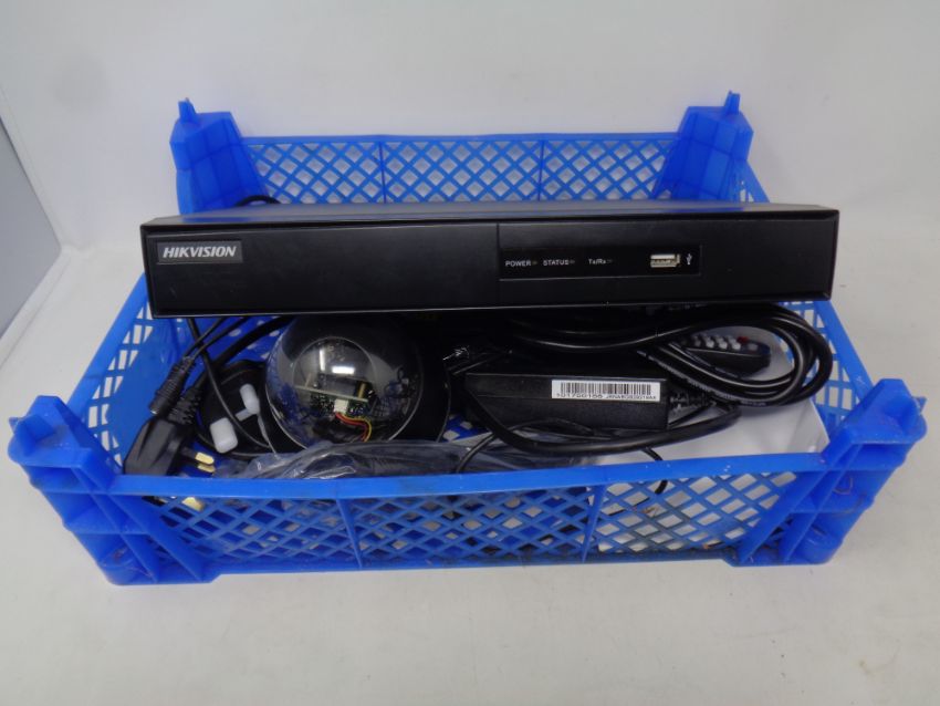 A Hikvision digital video recorder with leads and remotes together with a CCTV eye