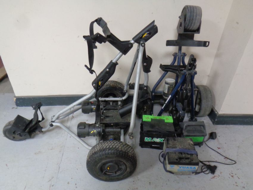 Two electric golf carts with batteries and one charger