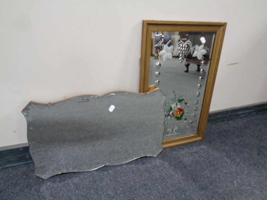 A hand painted etched glass bevel edged mirror in gilt frame together with a further shaped frameless bevel edged mirror