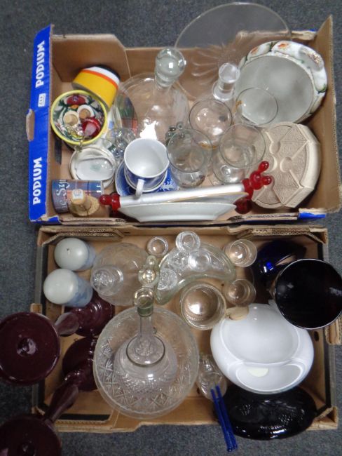 Two boxes containing miscellaneous glassware and ceramics to include ship's decanter, claret jug, vases, candlesticks with candles