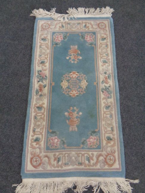 A Chinese embossed fringed rug on blue ground