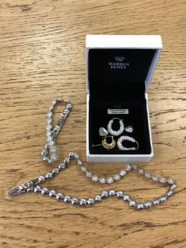 A costume necklace with matching bracelet together with 3 9ct gold earrings, a pair of Swarovski 9ct gold crystal earrings