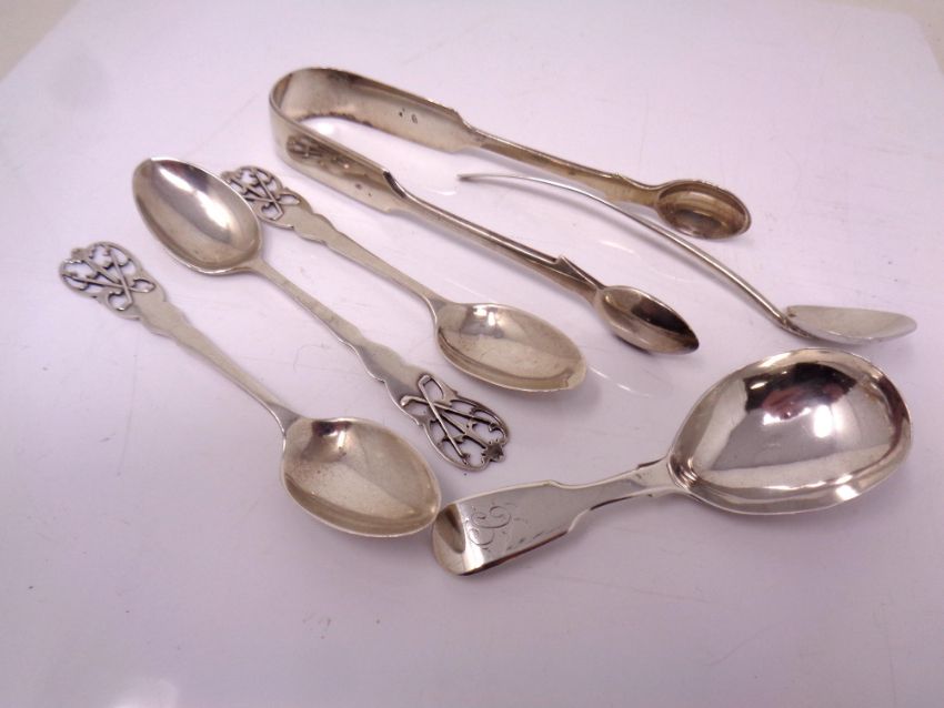A small quantity of silver cutlery including caddy spoon, sugar tongs, teaspoons, 103.3g.