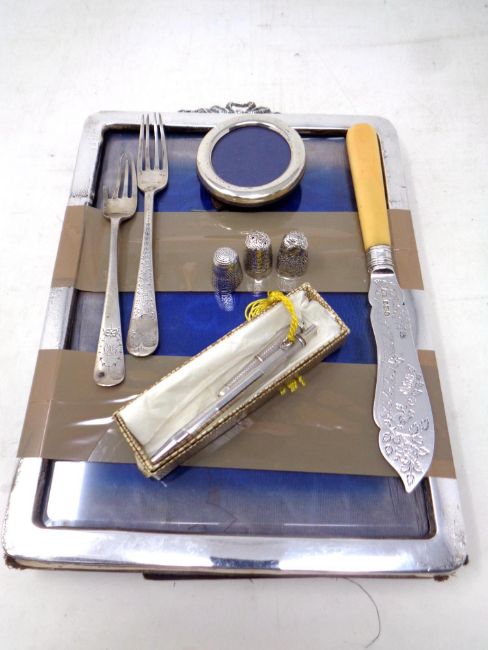 A rectangular silver photograph frame together with 2 silver forks, a small circular silver photograph frame, 3 silver thimbles, silver bladed knife and a silver propelling pencil.