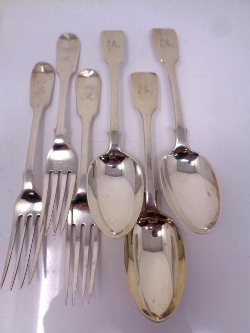 3 silver dessert spoons together with 3 silver dessert forks, 302g.