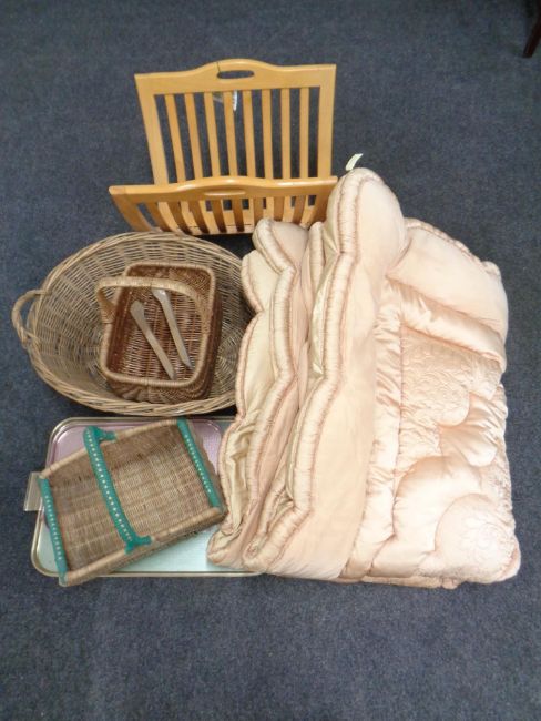 A beech magazine rack, wicker basket, trays, eiderdown etc