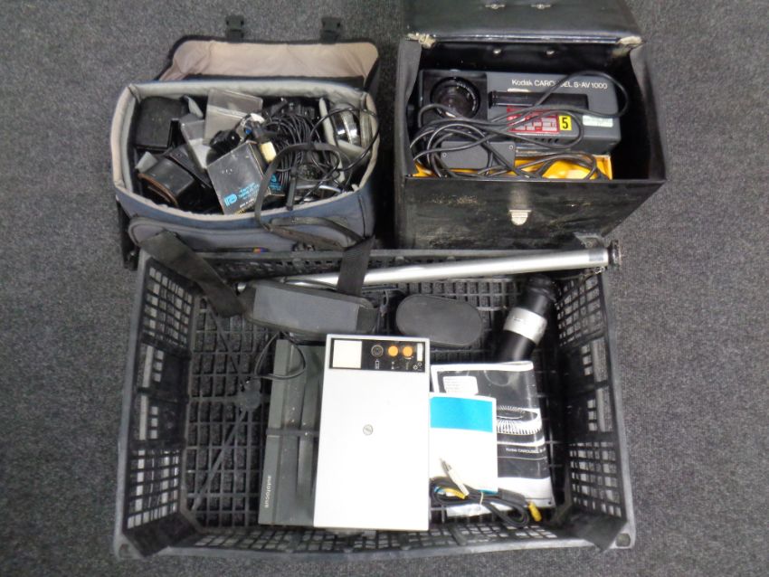 A crate of photographic equipment, Rollei and Kodak projectors etc
