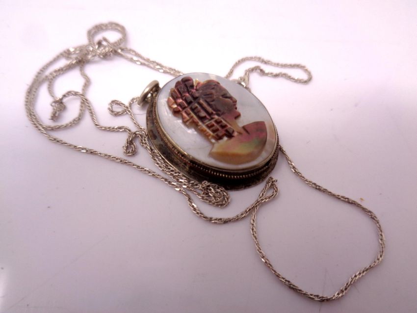 A silver pendant on chain.