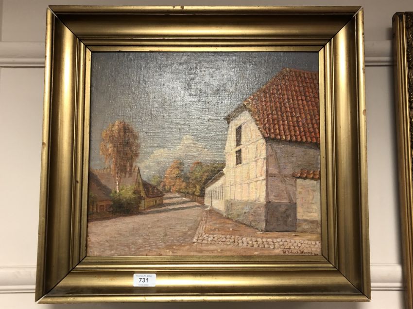 H E Hansen : a cobbled street, oil on board 41cm x 35cm
