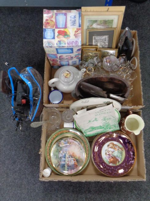 Two boxes of ceramics and glass, decorative plates etc