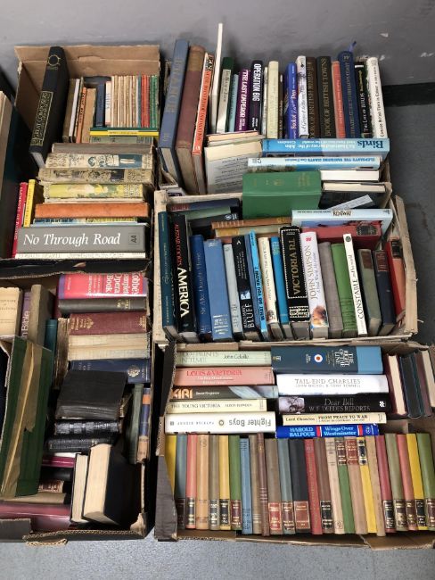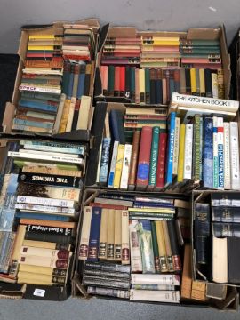 Two pallets containing eleven boxes of books, 20th and 21st century novels, wine, Dickens, composers etc