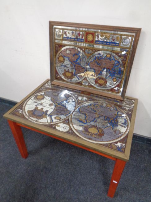 A brass bound mirrored coffee table depicting a map of the world together with a matching wall mirror.