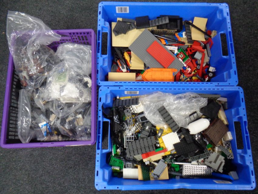 Three crates of Lego and other plastic building blocks