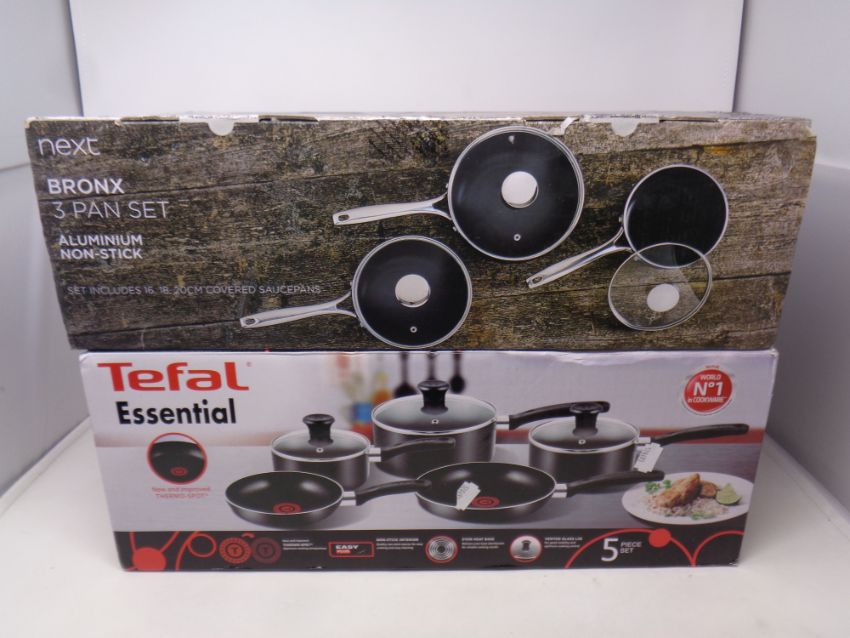 A Tefal Essential pan set together with a further Next aluminium pan set