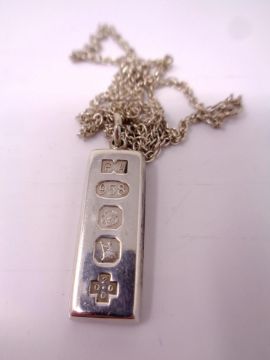 A silver ingot on chain.