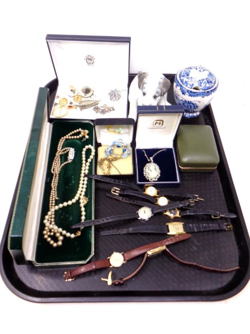 A tray of vintage wrist watches, Russian dog figure, costume pearls etc
