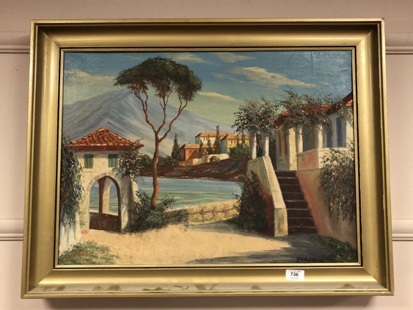 Continental school : Villa with mountains beyond, oil on canvas 62cm x 45cm