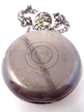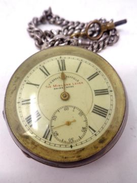 A antique Silver pocket watch on chain with T bar, the dial marked the Midland lever.