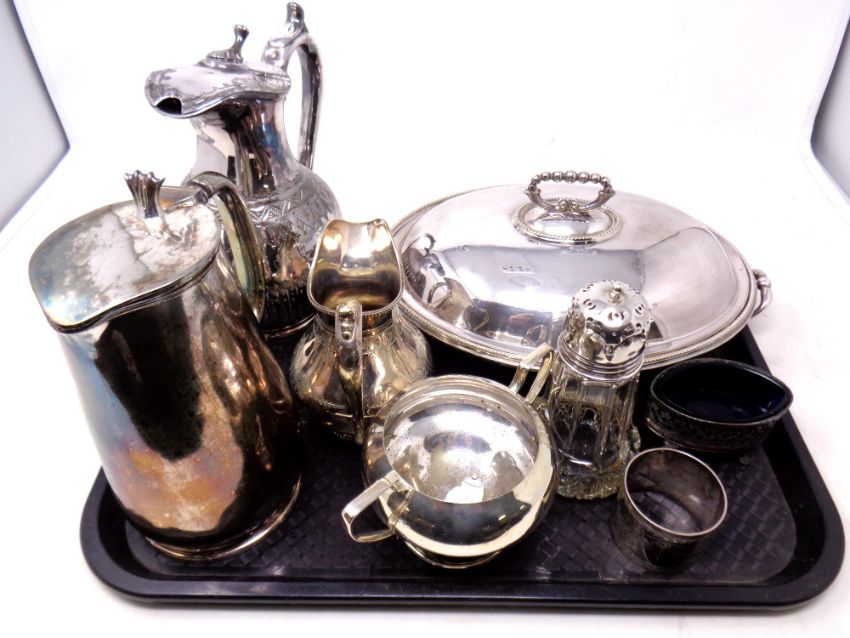 A tray of silver plated items, hot water jug, breakfast dish with cover, sugar sifter