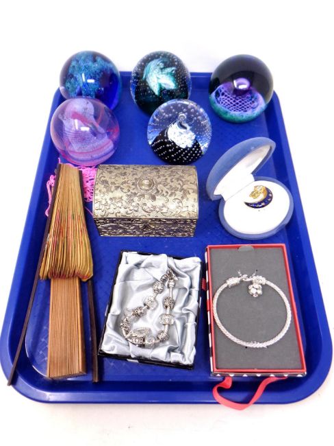 A tray of glass paperweights, costume jewellery, decorative fan etc