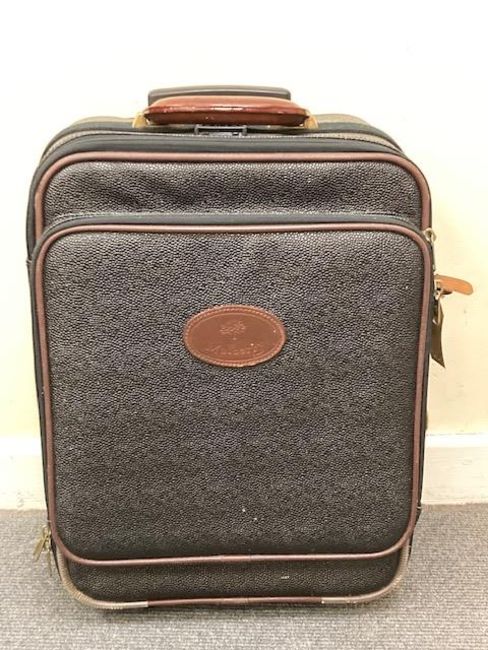 A Mulberry Scotchgrain (black with dark tan leather trimmings) cabin-sized suitcase, two wheels with pull-out handle, with separate zipped compartments to front and back, with Mulberry tartan lined interior, with original Mulberry leather and brass luggage label, overall dimensions 52 cm x 38 cm x 26 cm.
