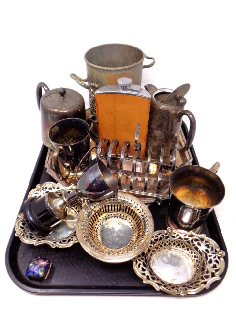 A tray of silver plated items including dishes, toast rack, hip flask and tray etc