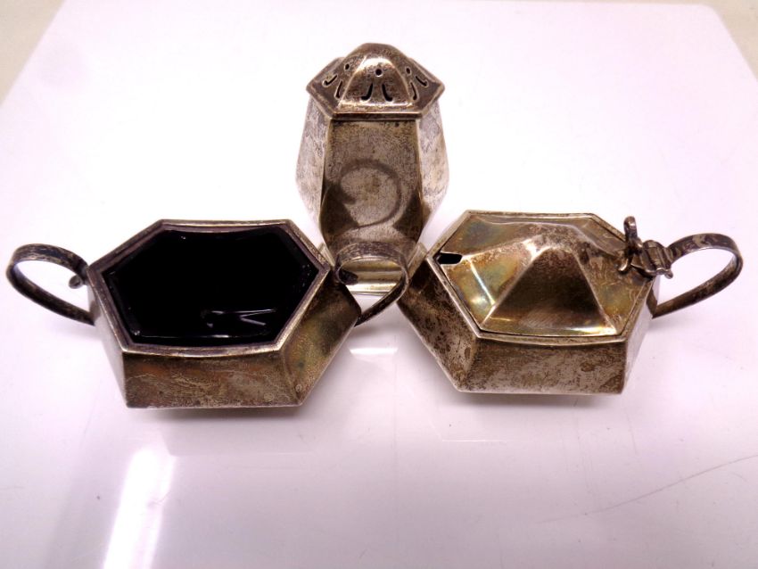 A three piece silver cruet set