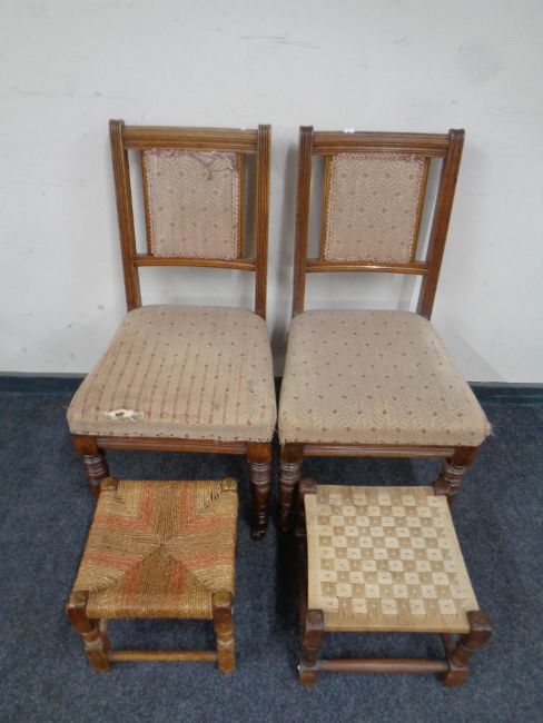 A pair of Edwardian oak dining chairs together with two rush seated stools