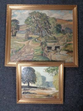 An oil on board depicting trees by a bridge, together with a further oil on board signed K Johsnon. (2)