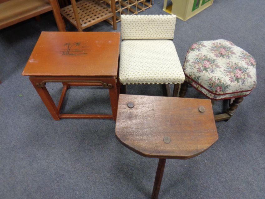 A Chinese style side table together with a hexagonal stool, rocking stool and milking stool