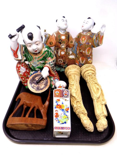 A tray containing Chinese porcelain figures, drummer, Chinese vase, resin figures etc