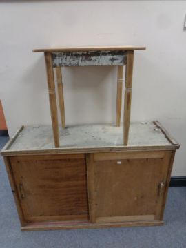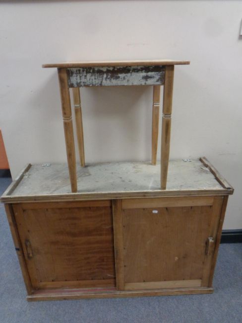 An antique pine sliding double door cupboard together with a stripped pine occasional table