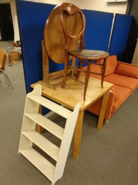 An Edwardian bedroom chair together with a folding occasional table in a walnut finish, set of painted bookshelves together with a contemporary square kitchen table