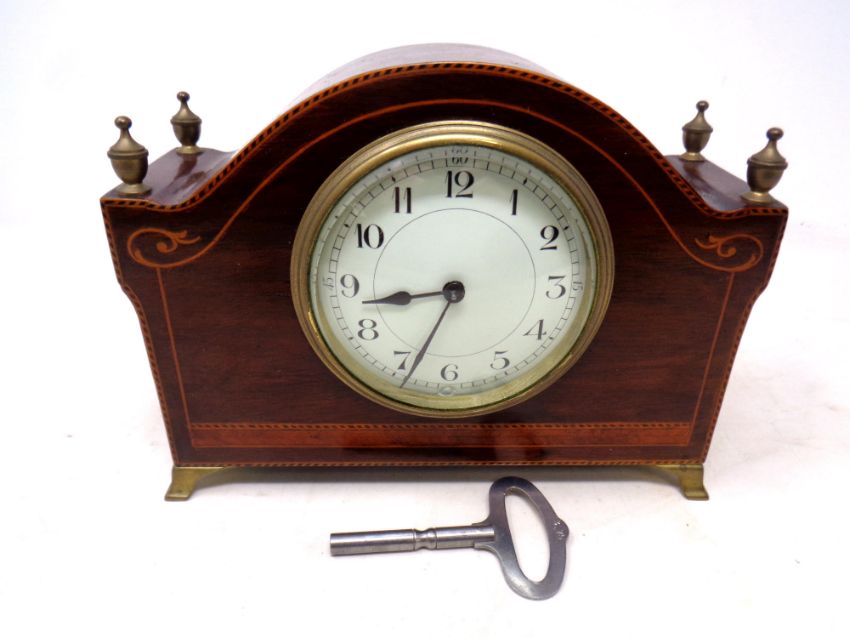 A late 19th century French inlaid mahogany mantel clock on raised brass feet with brass finials, with key.