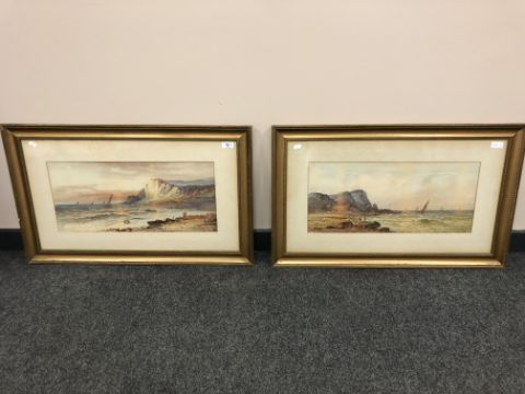 William Henry Earp (1831 - 1914) : Two Figures on a Rocky Beach with Fishing Boats and White Cliffs Beyond, watercolour, signed, 25 cm x 55 cm, together with the companion piece, framed as a pair. (2)