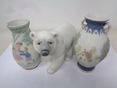 A Lladro figure of a Polar bear together with two Lladro embossed vases.