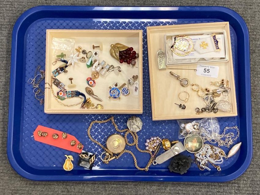 A tray of costume jewellery, brooches, chain, pendant etc.