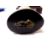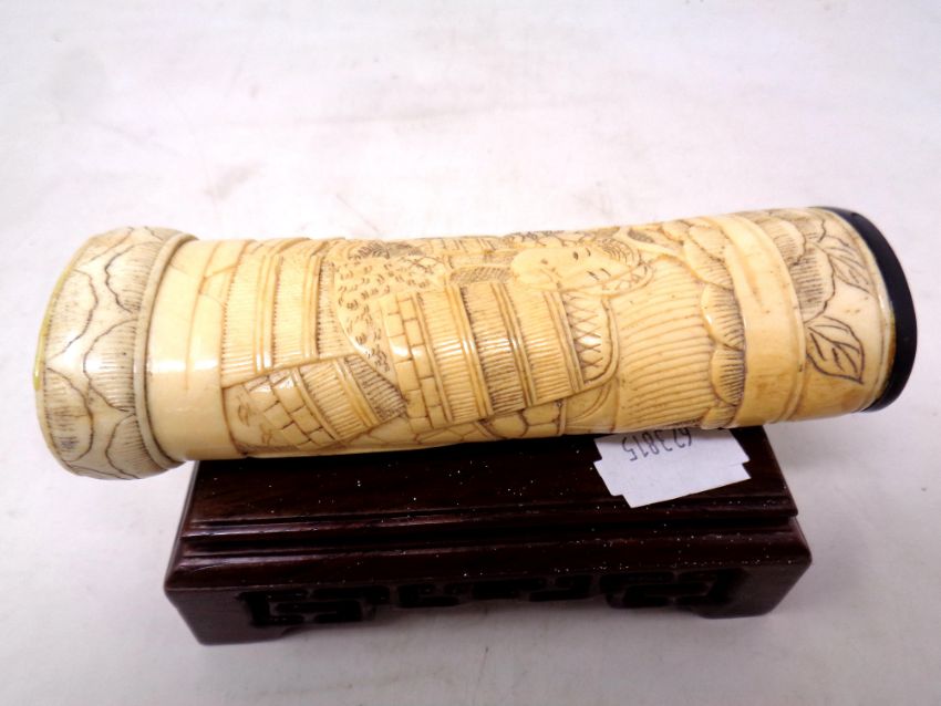 Three carved Japanese ivory and pen work netsuke on wooden stand together with a carved bone sword hilt on wooden stand