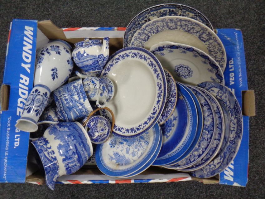 A box containing 19th century and later blue and white wear to include meat plates, dinner plates, Copeland Spode, Italian jug, willow patterned tankard, Delft vase etc