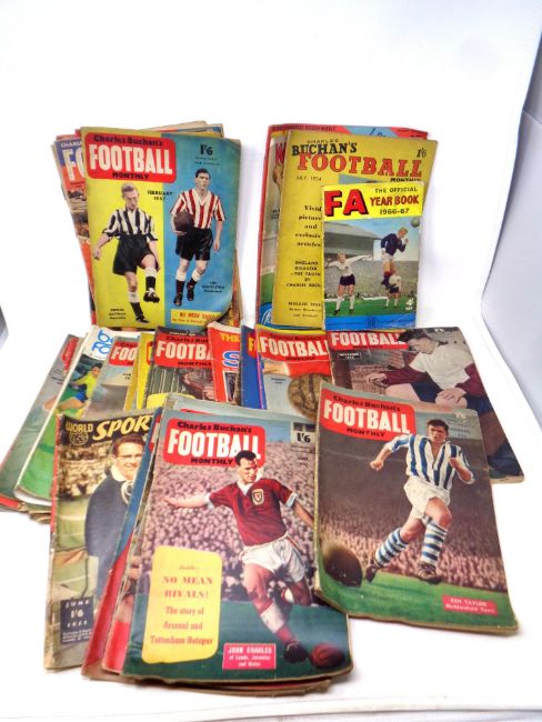 A basket containing mid 20th century football magazines to include Charles Buchan's football monthly, FA year book, GOAL etc
